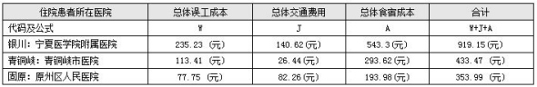 农村患者平均一次看病消费:银川市为:919.15(元)、青铜峡市为:433.47 (元)、固原市原州区为:353.99 (元)。如果患者是从贫困地区固原市原州区就医且能医治而免去到银川市附属医院就医,则费用可节省565.16 (元)。