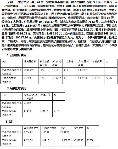 如果患者在本地医院就诊所产生的医疗总费用,可享受到70%的新农合报销待遇;如果去银川市各大医院就诊,只能享受到新农合的35%的报销待遇,而且是到各大医院治疗,各项收费均按三级甲等医院的收费标准执行,相应地高于贫困山区的县级医疗收费。