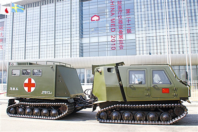首次参展的全地形履带式卫生急救车,是我军最新研制的卫生急救装备。该车采用双车体履带式结构,安装了卫星定位系统,可以伴随一线作战部(分)队在沙漠、沼泽、滩涂及雪地等特殊地形环境下实现越野机动,完成战场(灾害现场)伤病员的快速安全运送和途中紧急救治任务。该车随乘2名医护人员,一次可运送4名卧姿或8名坐姿伤员。