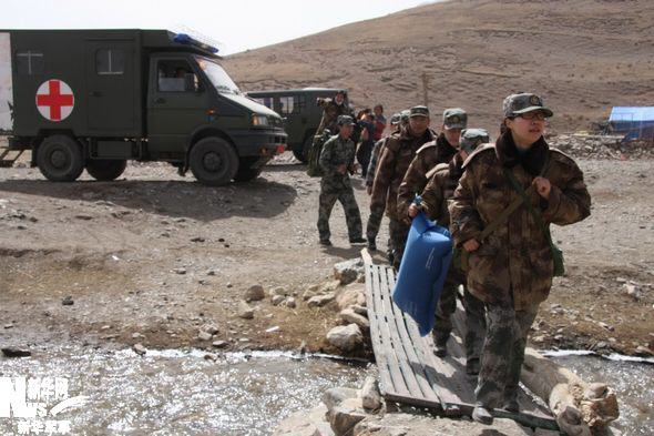 在果清村的一个山坡上,救护车无法前进,医疗队员只好背着药品和医疗设备徒步攀登,强烈的高原反应使他们每前进一步都十分困难。在牧民索南多江家,医护人员了解到他刚出生6个月的孩子,在地震中受轻伤和惊吓而一直哭闹不止,家中一位老人的腿也被砸伤,医疗队员们马上进行诊治,并给他们一家留下了常备药品。
