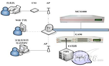 这套语音系统以MCS1000为核心语音交换设备,同时配备了由捷思锐自主研发的GA90网关设备(配带E1卡)。通过E1线路连接到电信运营商,作为连接MCS1000与公共电话网(PSTN)的中间设备。同时,在一期项目终端将部署200部WiFi手机供医护人员使用,通过无线网络平台,移动终端与MCS1000形成对接传输语音。