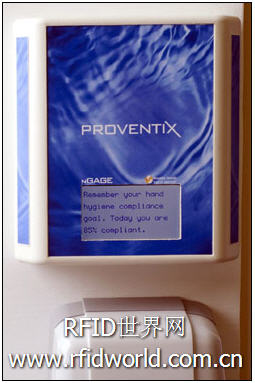 Proventix 在医院每个洗手台的肥皂或酒精装液器上方安装一个屏幕,用户洗手时可查看屏幕显示的信息,洗手台也安装一台 RFID 阅读器。虽然医疗中心最初仅在屏幕上显示洗手作用及对疾病影响等常识信息,将来 Proventix 软件会让屏幕显示针对洗手用户的个性化信息,如提供洗手台所位病房内的病人医疗信息。而且,屏幕上还可以根据要求显示 CNN 头条或体育赛事消息。另外,如果医生正在病房探视病人,洗手时他或她还可以看到病人检测,或其它医疗住处民,帮助他们判断下一步的治疗。 Proventix 在医院手术后楼层的各个房间安装一台 RFID 洗手站,该楼层共有 42 个病床,整个楼层共有 80 个洗手台。每位员工配戴一个 3.5 英寸长的塑料徽章,徽章含一个有源 RFID 标签,其 ID 码与个人的姓名、职位和其它信息在 Proventix 独立软件系统里相对应。阅读器形成的网状网使 RFID 标签在该层可被读取和定位。标签发送含其 ID 码的信号,Nix 称,阅读器接收信号,发送标签 ID 码及其 ID 码到一个网桥,网桥通过以太网连接到后端系统。目前该楼层采用了三个网桥。