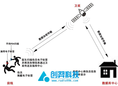 系统原理 参战士兵佩戴腕带式电子标签,其中保存有约定格式的电子数据。当士兵受伤后,医生可使用手持式PDA读取并识别腕带式电子标签中所保存的电子数据,从而自动识别出士兵的身份。手持式PDA通过天线发送出一定频率的射频信号,送出自身编码等信息,被接收器读取并解码后送至电脑主机进行相关处理。最终确认出受伤士兵的姓名、血型、过敏史等信息。