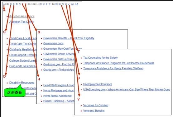 政府网站要保证具有较高的认知度和满意度,就必须围绕用户需求,提供丰富的服务资源,否则就变成了“花架子”和“摆设”,没有任何实际意义。美国政府网站在服务内容提供方面的效果是十分显著的。如下图所示,美国政府网站将服务主题的首字母作为初步分类的依据,将所有社保方面的信息服务划分到以26个英文字母开头的大类中,每个类别中的信息资源都十分丰富。