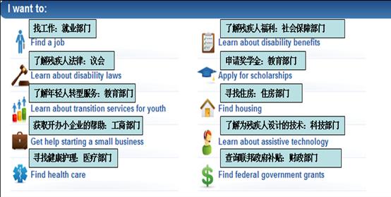 社会保障服务不仅是由社会保障部门来提供的,更是由多个政府部门来共同保障的,因此,美国政府网站作为门户网站,整合了各个部门的服务资源,“一站式”提供给用户,满足用户的需求。如下图所示,在残疾人社会保障服务中,美国政府网站整合了9个部门的服务资源,其中包括:就业部门的“找工作”、社保部门的“了解残疾人福利”、议会的“了解残疾人法律”、教育部门的“申请奖学金”和“了解年轻人转型服务”、住房部门的“寻找住房”、工商部门的“获取开办小企业的帮助”、科技部门的“了解为残疾人设计的技术”、医疗部门的“寻找健康护理”、财政部门的“查询联邦政府补贴”