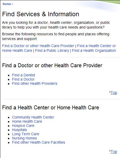 社会保障服务是由各种组织和个人提供的,其中组织包括政府组织、企业、非营利组织等,因此,政府在整合了自身服务资源的同时,要大力整合社会便民服务资源,将企业、非营利组织的资源,及公众需求强烈的个人的信息进行整合,以用户需求为中心对各种服务资源进行组合配置,打破各种资源之间的界限,集中提供给用户。如下图所示,为了方便用户获取社保服务,美国政府网站将全国的医生、健康护理员、健康护理中心的信息进行了整合,并开发成数据库,用户可以登录到美国政府网站查询到全国范围的健康护理个人或机构的信息,十分方面。