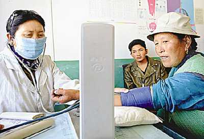 资料图片:达孜县人民医院的医生正在为一名农村妇女检查身体。 新华社记者 觉果 摄