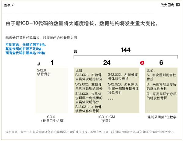 因为以前的ICD-9代码包含5位数而ICD-10新代码包括7位数,因此,数据结构将发生重大变化(图表2)。由于新代码与旧代码不能直接对应,程序逻辑也将出现重大变化。事实上,正如本文上面提到代码数量的大大增加,将导致对于诊断与治疗进行更为详尽的记录。