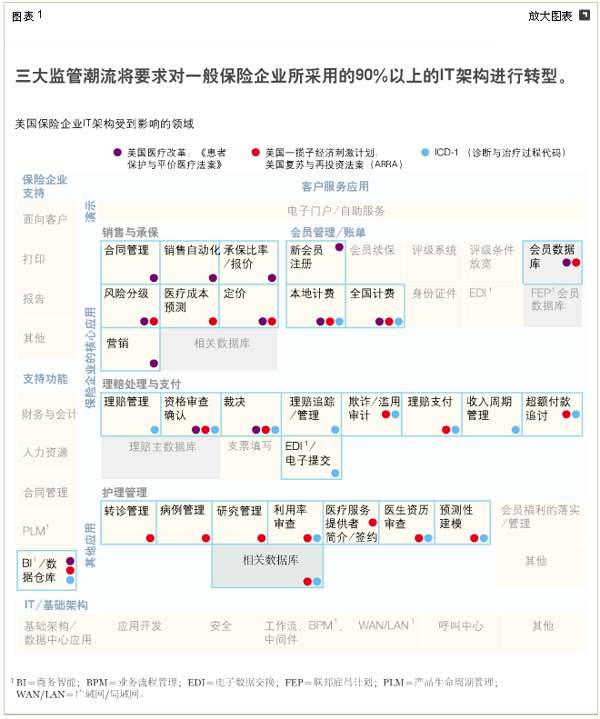三大监管潮流正在推动迫在眉睫的变革的产生,它们是:最近通过的联邦医疗改革法案,去年美国经济刺激一揽子方案中对医疗行业IT的新要求,以及ICD-10(这是一项姗姗来迟的在医疗保险企业与医疗提供者之间交换医疗数据的代码标准扩展计划)。这三大力量中的任何一个都将改变医疗保险企业为患者提供服务的方式,以及改变位于该行业核心地位的大量支付资金流的处理。IT系统则身处这两大变革的中心。