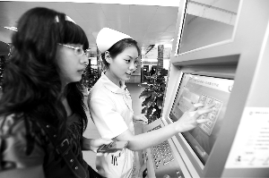 市卫生数据中心一期建设工程已完成,以后市民去任意一家公立医院看病,都不需要再带上病历只需一张“健康卡”,就能完成挂号、就诊、付费的全过程。图为医护人员向市民介绍电话挂号程序。