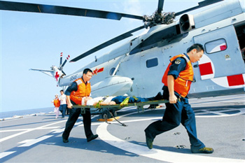 10月7日上午,正在亚丁湾海域执行“和谐使命-2010”任务的“和平方舟”号医院船,利用为护航官兵提供医疗服务的间隙,首次协同护航编队在远海开展了代号为“蓝海天使—2010”的医疗救护演练。
